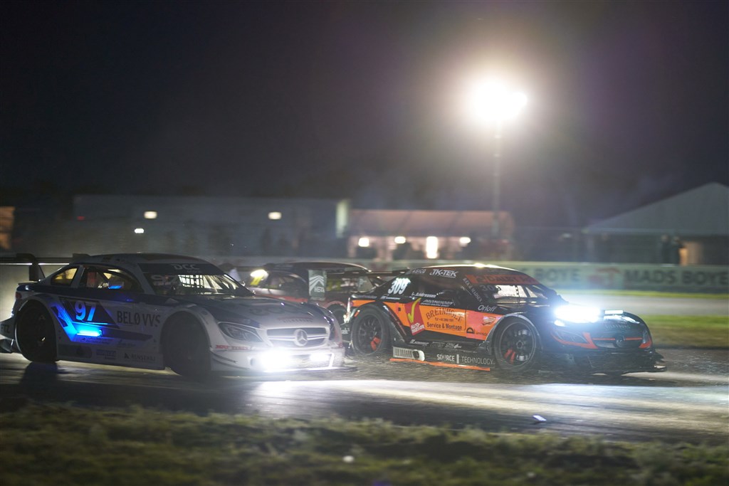 Andet løb starter lidt over 20. Nu er solen ved at blive slugt op af horisonten i den vestlige ende af Padborg Park. Selv om der er lys på racerbilerne, bliver der stor forskel mellem den første og den sidste omgang i løbet.