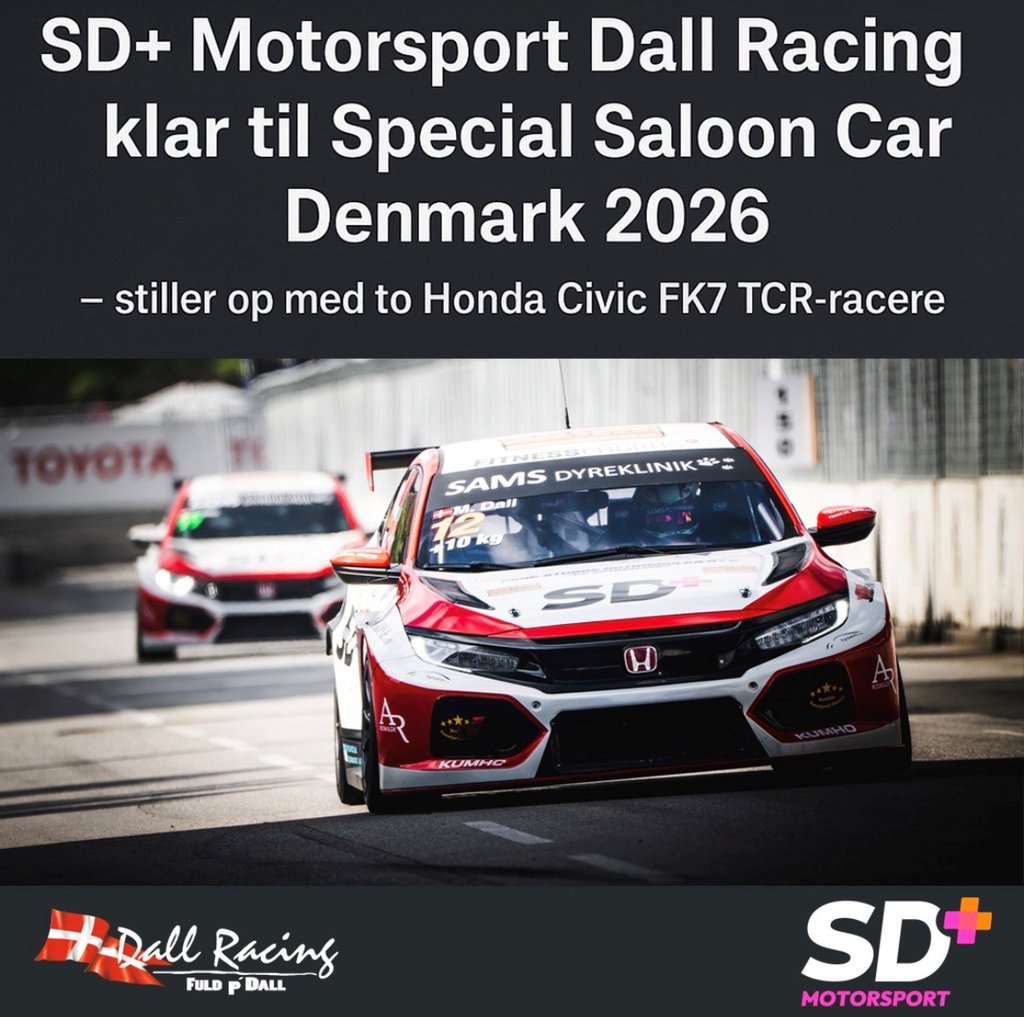 - stiller op med to Honda Civic FK7 TCR-racere SD+ Motorsport Dall Racing intensiverer deres satsning i dansk motorsport og bekræfter i dag, at teamet stiller til start i Special Saloon Car Denmark 2026. Det sker med hele to Honda Civic FK7 TCR-biler, som begge gennem vinteren er blevet gennemgået og optimeret til den kommende sæson.  (Foto: Dall Racing)